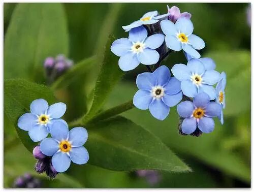 勿忘我的英文名字forget-me-not直接翻译自古法语“ne m’oubliez mye(勿忘我)”。文艺复兴时期的浪漫主义者认为,如果他们戴上这种色彩柔和的花朵,就永远不会被爱人遗忘。勿忘我因此成为忠诚永恒爱情的象征。